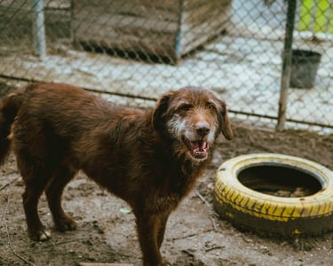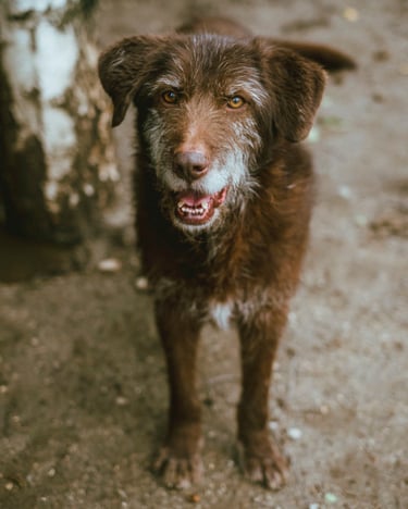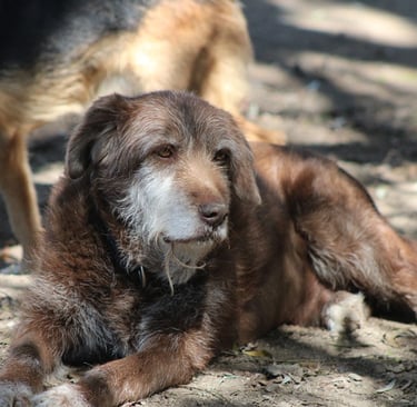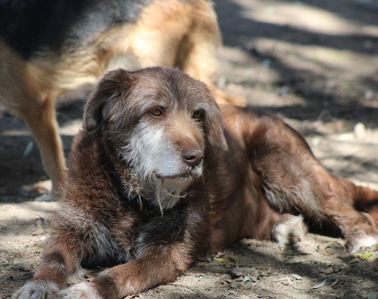 Deixado acorrentado ao portão do nosso abrigo, já está connosco à uma década, a maior parte da sua vida passada aqui. Aqueles pelinhos brancos não enganam, mas só mesmo os pelinhos, porque de saúde e energia ele tem para dar e vender.